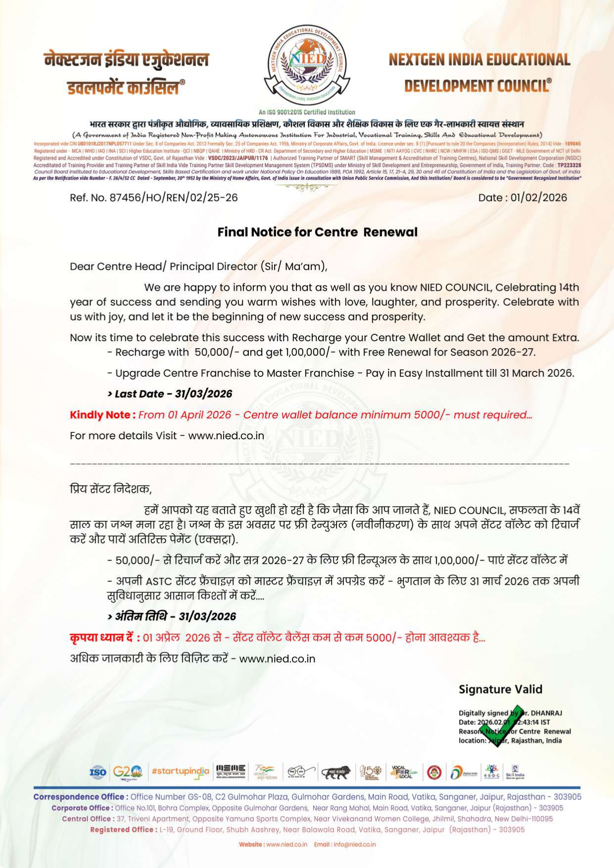 In my career of 20 years when I got NIED COUNCIL on 23/02/2022 I felt like a bird in the desert because I can’t promote and help my students since 2003 for accelerate them career but NIED COUNCIL is was very useful for not only working professional but it helps a drop out students and also house wife. NIED COUNCIL is different reorganization for its useful and effective syllabus Keep up with the times, it’s APPROVALS, and CERTIFICATE are of great value. It is very useful to keep our students in job, promotion and foreign file. Even student represent themselves for many platforms. Heartily thanks for NIED's honorable Dr. DHANRAJ SIR because they solve our Query On The Spot even of a small center like us. They provide GUIDANCE and MOTIVATE us. Special THANKS to all Team for kind cooperation and support Thank you so much for including Siddh Institute in being part of The NIED COUNCIL.