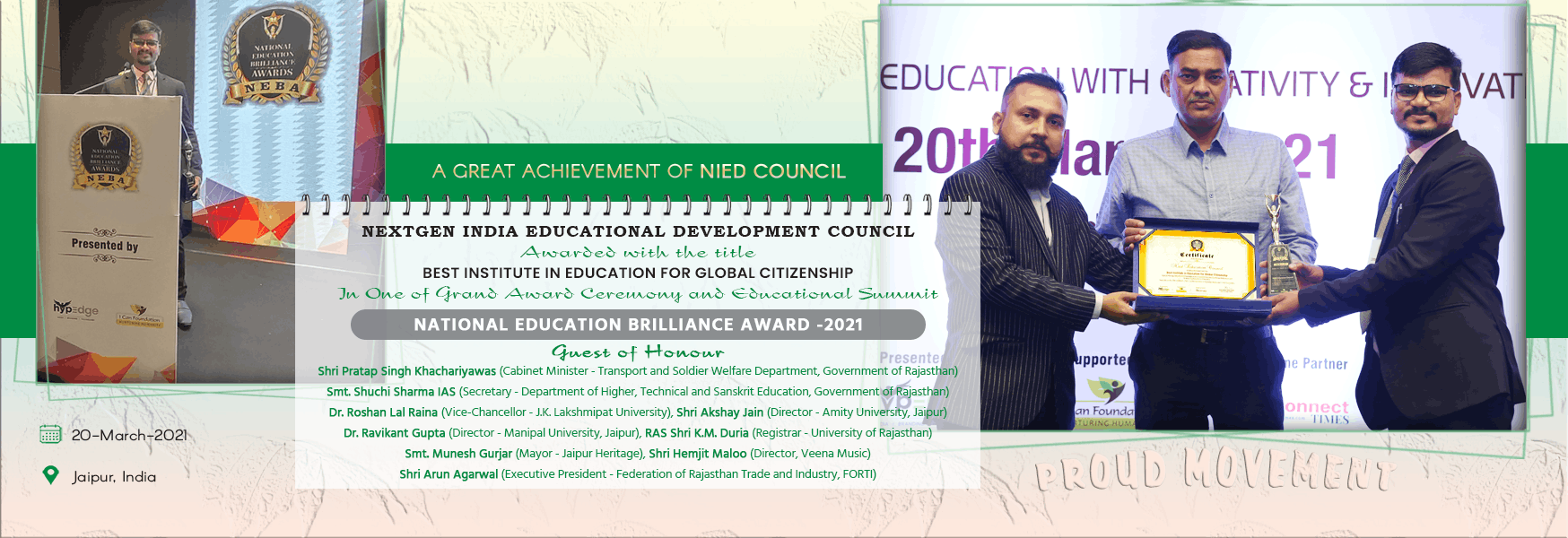 शिक्षाविद एड. डॉ. धनराज एवं श्रीमति कविता जी द्वारा स्थापित एन. आई. ई. डी. काउंसिल संस्थान निरंतर विगत 13 वर्षों से नौजवानों की स्किल्स एवं आत्मनिर्भरता की और कदम बढ़ाते हुए कार्य कर रहा है, वास्तव में आज के समय में शिक्षा का उद्देश्य सुदृढ़, ज्ञानात्मक समाज निर्माण करते हुए मनुष्य की बौद्धिक, सामाजिक, शारारिक, भावनात्मक क्षमताओं और नैतिकता के गुणों को एकीकृत तरीके से विकसित करना है, क्योंकि भारत की मौजूदा शिक्षा प्रणाली समकालीन स्थिति में चुनोतियों का सामना करने में सक्षम नहीं है। इस संदर्भ में आपका सोचना सार्थक है शिक्षा का लक्ष्य अंततः उन्मुक्त और आत्मविश्वास से व्यक्ति का निर्माण करना है जो विपरीत परिस्तिथियों में भी चुनोतियों का सामना सफलतापूर्वक कर सकें। आज एन. आई. ई. डी. काउंसिल को भारत में ही नहीं अपितु विश्वस्तरीय पहचान आपके अथक प्रयासों से मिली है जो विकसित राष्ट्र निर्माण के लिए सच्चा आइना है। आप द्वारा बौद्धिक एवं शैक्षिक स्तर पर वंचित,शोषित समाज को जोड़ने का संकल्प निरंतर जारी रहें.... शुभेच्छु :- बी. एम. सिंह मोखरिया